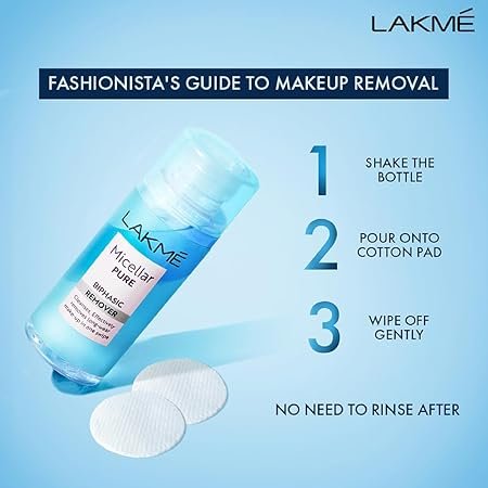 Melt away long lasting, waterproof makeup effortlessly with the new Lakme Bi-phasic Remover. Powered by Miceller technology, this 2 phase formulation of oil in water instantly removes waterproof, long lasting makeup and leaves skin feeling hydrated. Oil lifts all kinds of makeup lip, face and eye and water makes sure skin is refreshed with no greasy afterfeel. It has magnetic micelles that go deep inside the pores and pull out makeup, dirt and pollutants like a magnet, gently cleansing skin not just from the surface but from deep within. 92% users who tried it say that it is effective at removing lip and eye makeup effectively in a single swipe! Effortless makeup removal in just 3 simple steps! Shake the bottle well. Pour generously onto a cotton pad. Swipe the soaked cotton pad around closed eyes, lips and face to take off all the makeup Suitable for all skin types. Avoid getting into your eyes, no need to rinse after use. Get onto Double Cleansing, the latest skincare regime that fashionistas are using to deep clean their skin. First use the Lakme Bi-phasic remover to melt away all the makeup and sebum. Then use Lakme Micellar Facewash to wash away dirt and impurities.